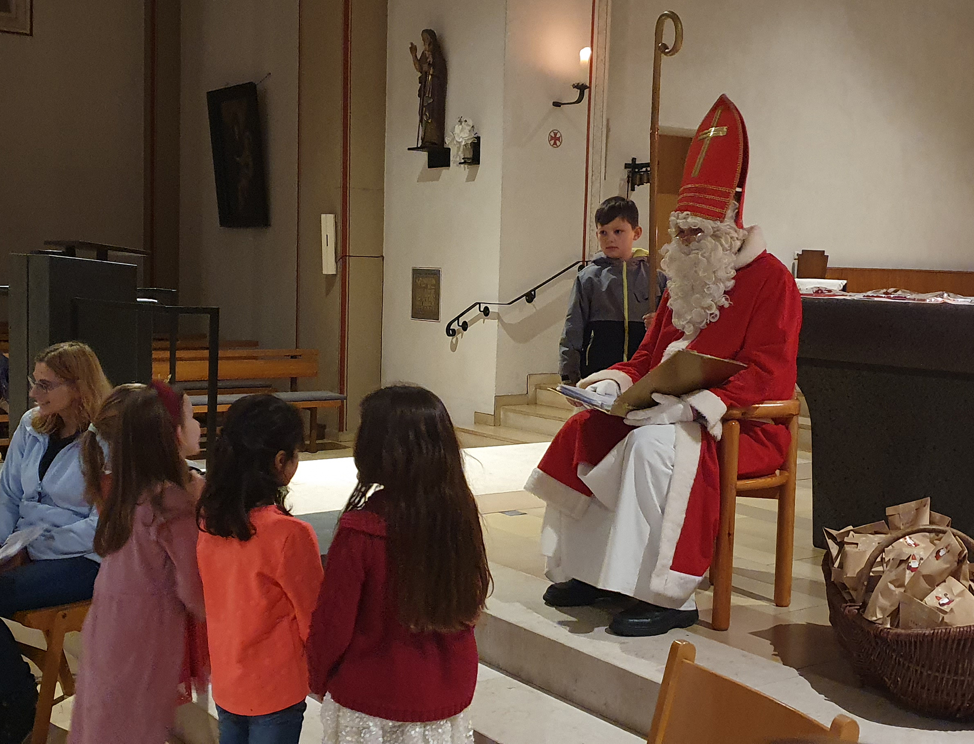 Die Spannung stieg spürbar, als es plötzlich an der Kirchentür klopfte und der Nikolaus „leibhaftig“ eintrat, während er mit einem gemeinsamen Lied begrüßt wurde – und war sichtlich gerührt. Geduldig erklärte er den Kindern, warum er einen so besonderen Hut trägt und weshalb ein Hirtenstab zu ihm gehört.