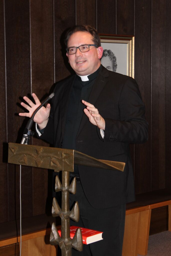 Die Verbindung geht zurück auf das Jahr 2021, als Professor Schlögl zum ersten Mal das Mutterhaus besuchte und dabei auch noch den damaligen Generalsuperior Karl-Heinz Haus kennenlernte. „Der Funke ist sofort übergesprungen“, erinnerte sich Pfarrer Jaison in seiner Begrüßung. Daraus sei die Idee entstanden, den geschätzten Theologen zu weiteren Vortragsabenden einzuladen. – Ein gelungener Plan, der nun zum wiederholten Mal zahlreiche Interessierte in die Hauskapelle führte.