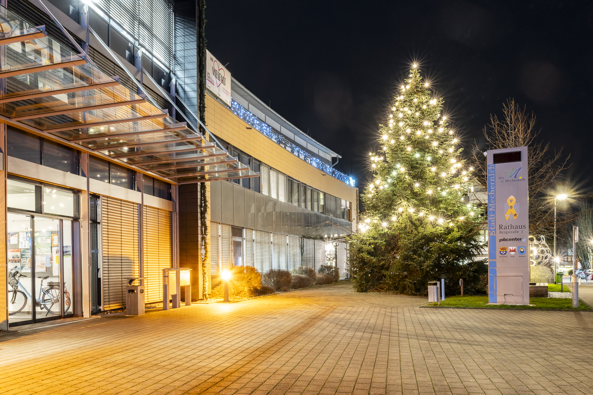 Damit der Rathaus-Vorplatz in der Adventszeit wieder stimmungsvoll erstrahlt, rückten später die Elektriker der Firma Braun an. Sie bestückten die stattliche, dunkelgrüne Nordmanntanne mit unzähligen Lichtern. Nun leuchtet der Weihnachtsbaum erneut weithin sichtbar und stimmt die Mechernicherinnen und Mechernicher auf die bevorstehenden Festtage ein.