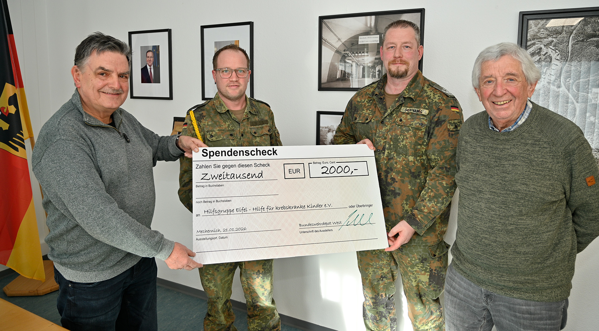 Den symbolischen Scheck nahmen der Vorsitzende Willi Greuel aus Mechernich-Lückerath und Mitglied Achim Liedtke entgegen. Die Summe stammt aus einem „aufgerundeten Überschuss“ einer Adventskalender-Aktion in verschiedenen Bundeswehr-Standorten des Depots, die weit über die Eifel hinausreichte. Das Ergebnis: beeindruckende 2.000 Euro für krebskranke Kinder.