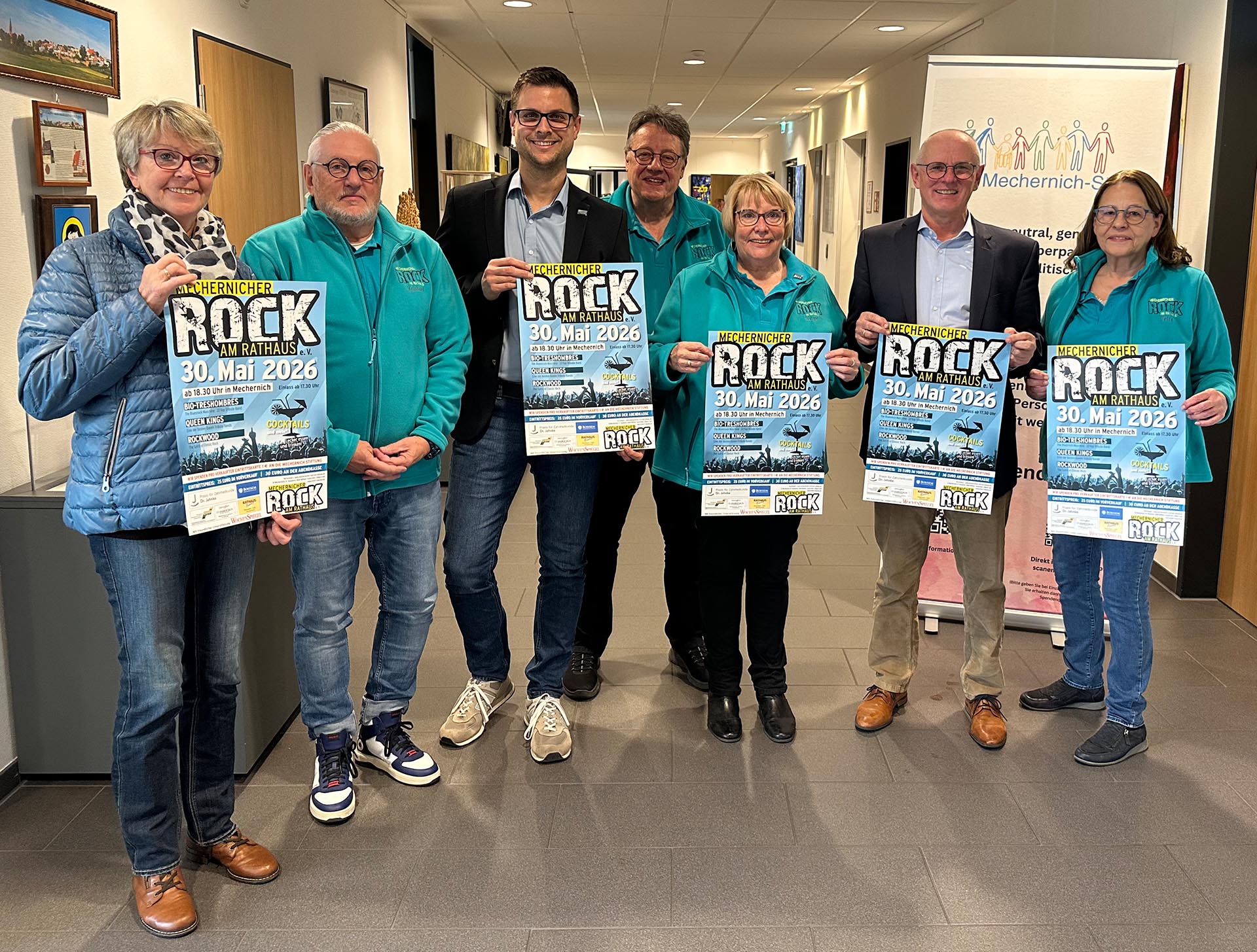 Laden herzlich zu Rock am Rathaus am 30. Mai 2026 ein: (v. l.) Maria Jentgen (Mechernich Stiftung), Reinhard Kijewski (Mechernicher Rock am Rathaus e.V.), Bürgermeister Michael Fingel, Michael Sander und Margret Eich (Mechernicher Rock am Rathaus e.V.), Ralf Claßen (Mechernich Stiftung) und Petra Himmrich (Mechernicher Rock am Rathaus e.V.). Pro Karte wird ein Euro gespendet. Foto: Henri Grüger/pp/Agentur ProfiPress