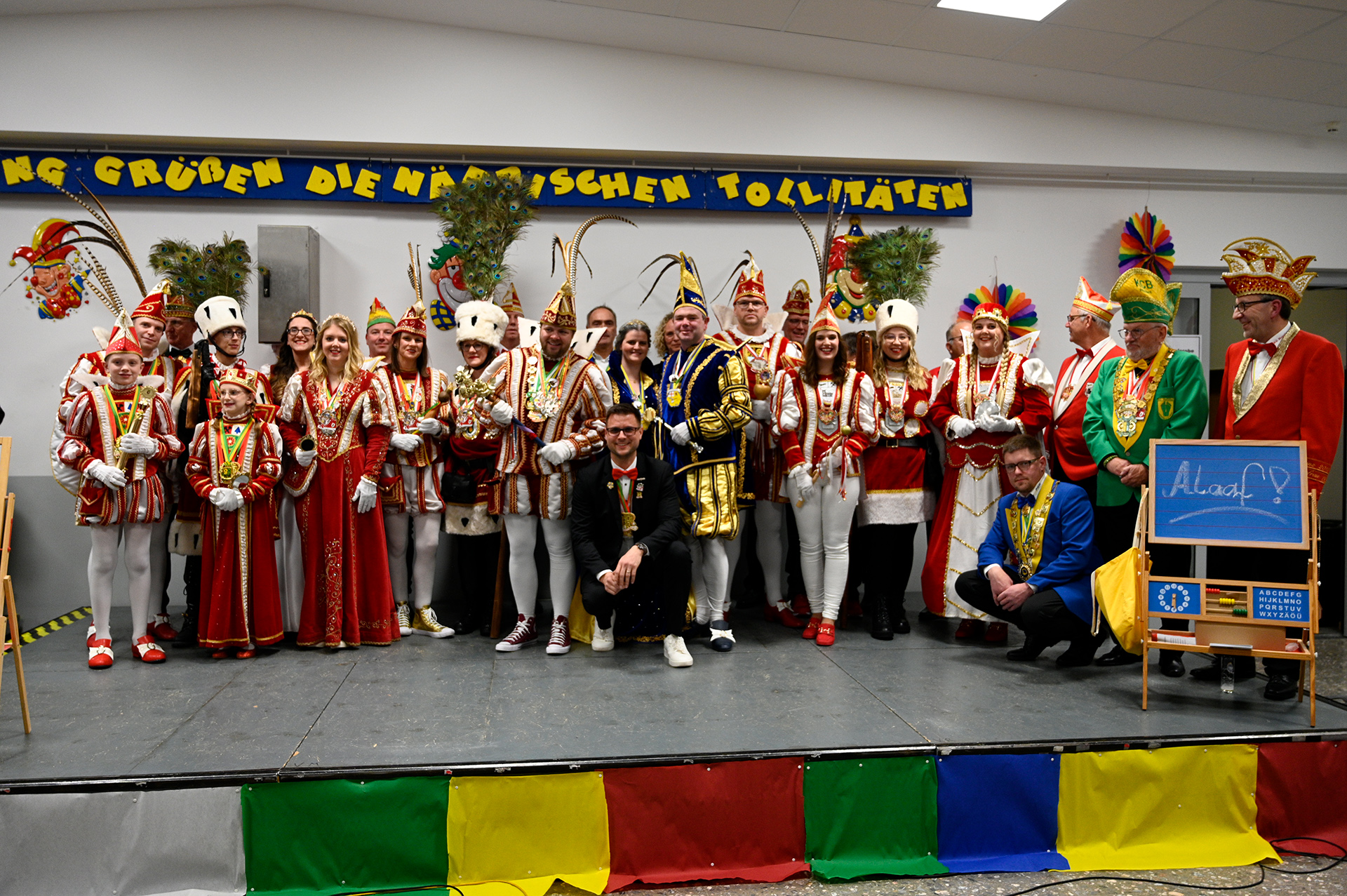 Aus Vussem reiste der Karnevalsverein 1977 Vussem e. V. mitsamt Jugendgarde an, die einen beeindruckenden Tanz hinlegte. Präsident und Moderator sprachen von einer langen Tradition: Seit Mitte der 1990er Jahre sei man – abgesehen von Corona – praktisch durchgehend mit Tollitäten im Stadtgebiet unterwegs. In dieser Session steht „Partyprinz“ Stefan an der Spitze. Ein „Seiteneinsteiger“, wie sein Präsident Michael Mertes schmunzelnd erklärte – immer dabei, aber nie „ganz vorne“. Das ändert sich nun: Gemeinsam mit seinen Adjutantinnen Nadine und Joline sowie Adjutant Thomas verbreitete er echtes Party-Feeling. Sein Motto: „Groß und klein, ob dick oder dünn, von fern oder nah – solange wir die Jecke sinn, sind wir alle gleich.“ Weil der Prinz neben Vussem auch am DJ-Pult zuhause ist, war schnell klar: Dieser Abend bekommt noch eine Extraschicht Feierlaune – spätestens nach dem Ausruf: „Bock auf Party?!“
